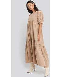 Puff Sleeve Pleated Tiered Midi Dress - Naturel